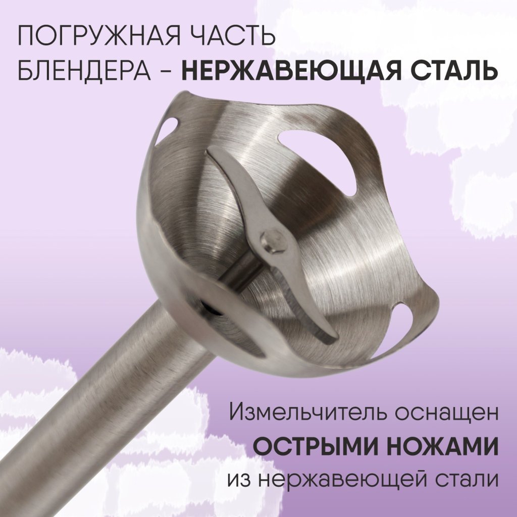 Мощность 1100Вт. Блендер + миксер. Регулятор скорости. Turbo кнопка. Soft touch покрытие. Лезвия из нержавеющей стали. Погружная часть блендера из нержавеющей стали. Размер изделия 225*135*110 мм.