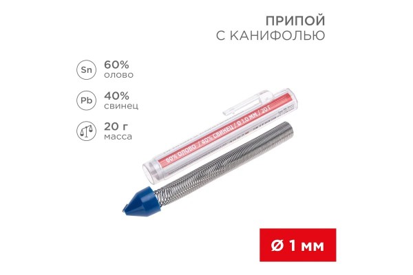 Припой с канифолью REXANT, 20 г, O2.0 мм, (олово 60%, свинец 40%), колба, 09-3104