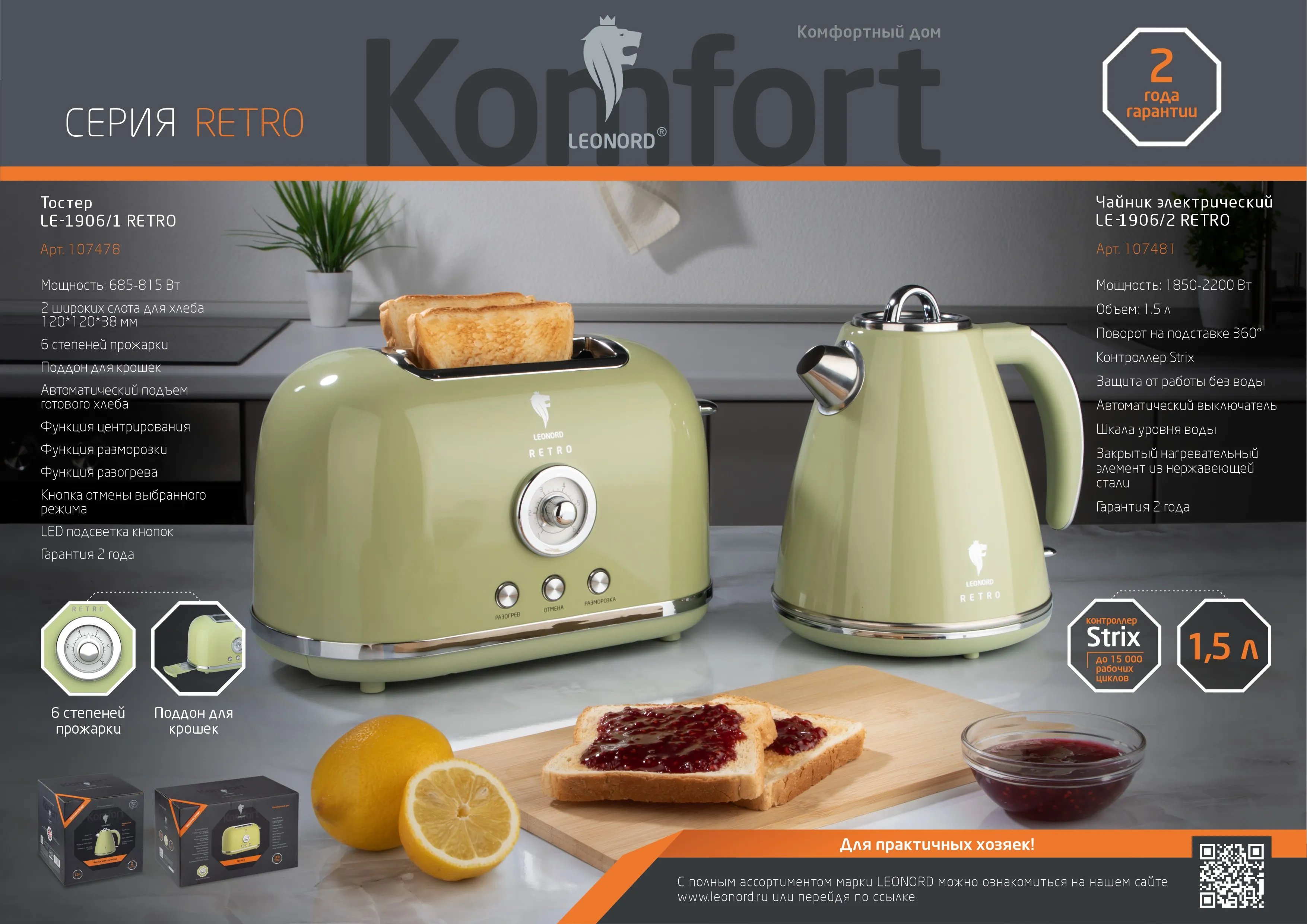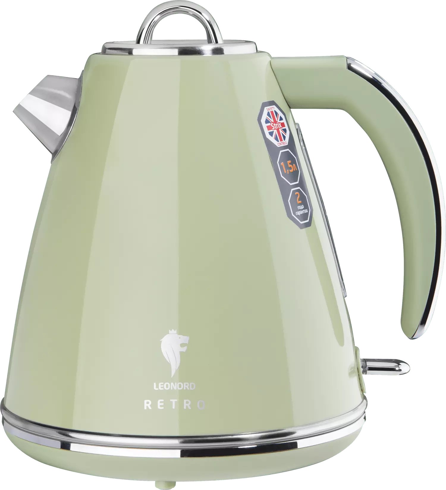 Этот электрический чайник от Leonord, сочетает в себе современные функции и очаровательный ретро-стиль. Чайник идеально подходит для приготовления чая и кофе. Имеет функции автоматического отключения, поворот на подставке 360° и защиту от работы без воды. Великолепно сочетается с тостером из коллекции RETRO с такой же глянцевой поверхностью.