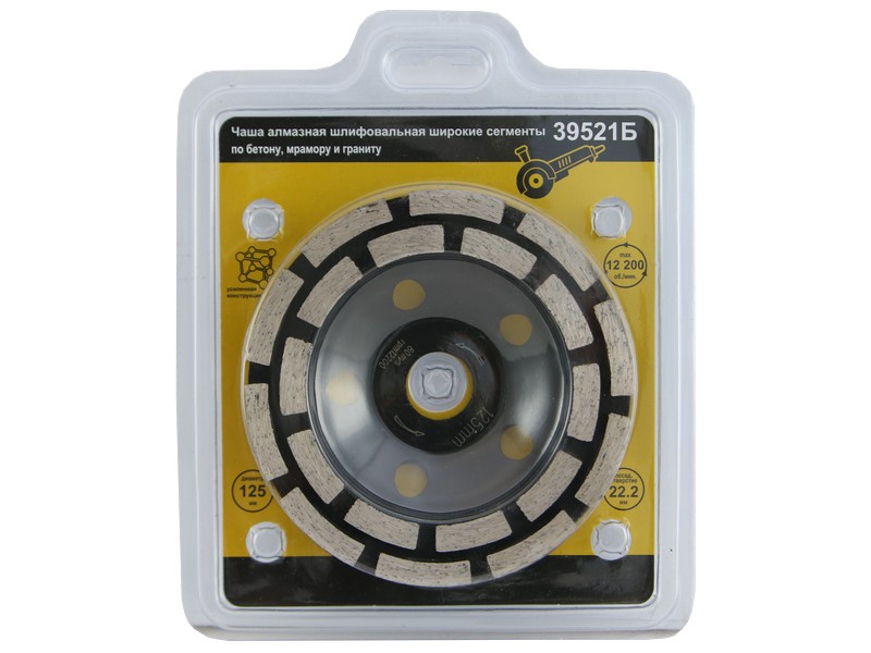 Диск-чаша алмазный 125х22,2 2 ряда сегментов. Для углошлифовальных машин. Посадочный диаметр 22,2 мм. Для работ по бетону, граниту, мрамору и другим материалам. Удобен для выравнивания кромки, шлифовки, полировки и работ, где необходима тонкая обработка. Двухрядная сегментированная поверхность чашки обеспечивает быструю зачистку обрабатываемого материала, в том числе обладающего повышенной вязкостью. Материал: высокоуглеродистая сталь, рабочая часть-композит с техническими алмазами. Упаковка: блистер с подвесом