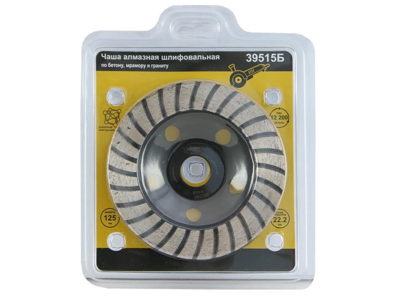 Диск-чаша алмазный 125х22,2 широкие сегменты «Турбо» для углошлифовальных машин. Посадочный диаметр 22,2мм. Удобен для выравнивания кромки, шлифовки, полировки и работ, где необходима тонкая обработка. Работает по бетону, граниту, мрамору и другим материалам. Алмазные резаки расположены по кругу на рабочей поверхности перпендикулярно по отношению к направлению вращения. Минимальное расстояние между ними создает почти сплошное кольцо. Множество сегментов гладко полируют поверхность, поэтому изделие применяется для финишного шлифования бетонных стяжек на небольших площадях и для фигурной обработки камня. Материал: высокоуглеродистая сталь, рабочая часть-композит с техническими алмазами. Упаковка: блистер с подвесом
