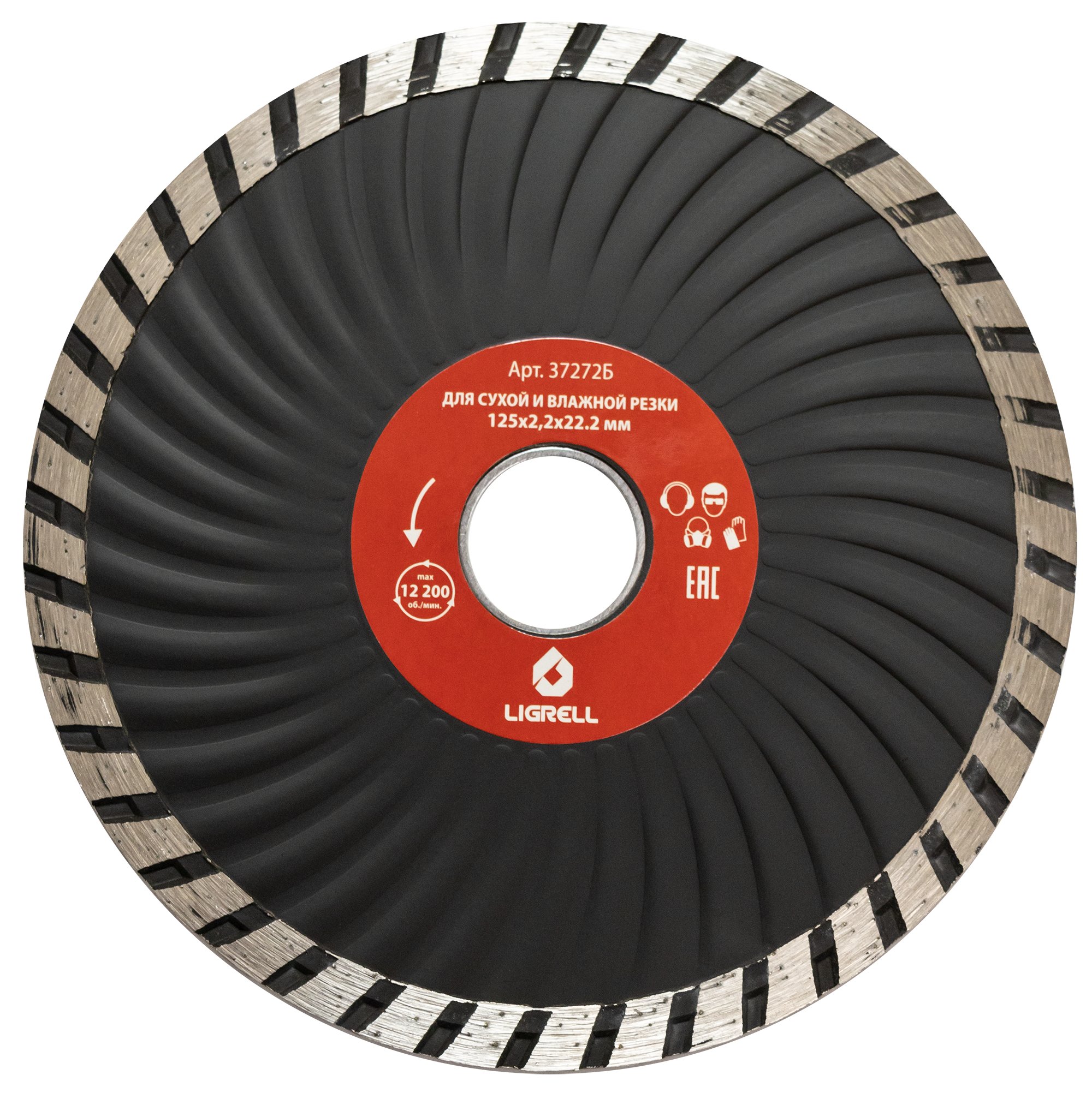 Диск отрезной алмазный 125х2,2х22,2 турбо-волна , универсальный, усиленная конструкция. Для сухой и влажной резки бетона, кирпича, гранита, мрамора и камня. Изготовлен методом горячего прессования, основание из инструментальной стали, режущая кромка - композит с техническими алмазами. Для использования с УШМ соответствующего типоразмера. Посадочный диаметр 22,2мм. Упаковка: блистер с подвесом