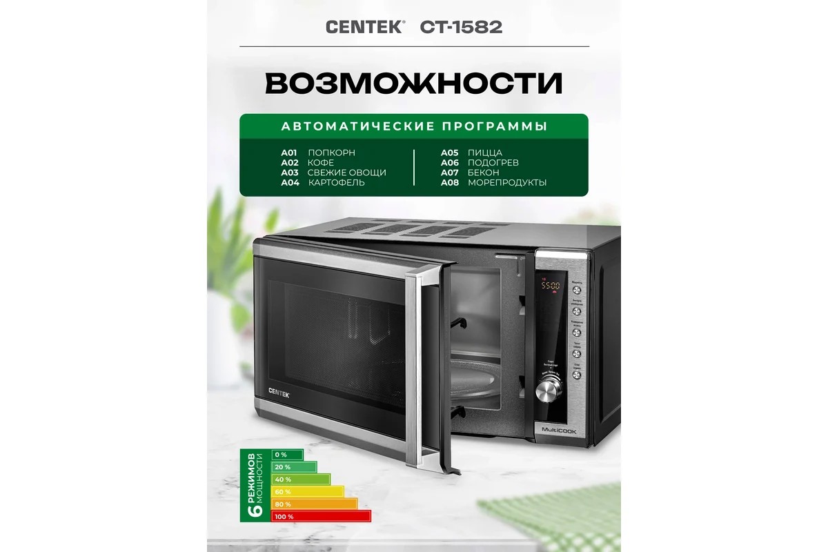 Удобная микроволновая печь Centek CT-1582 с объемом камеры 20 литров является незаменимым помощником на современной кухне. Прибор выполняет задачи по приготовлению, подогреву и размораживанию продуктов.