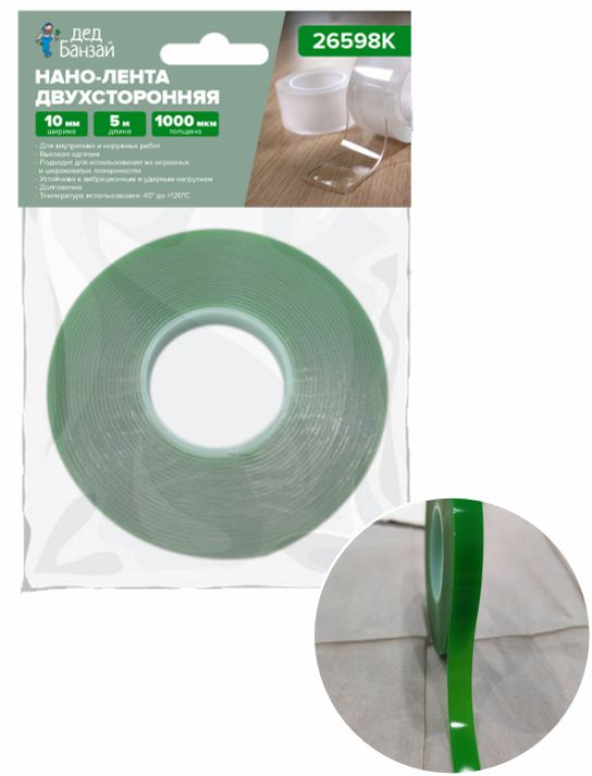 ЛЕНТА ДВУХСТОРОННЯЯ НА ОСНОВЕ ВСПЕНЕННОГО АКРИЛА для внутренних и наружных работ, высокая адгезия, стойкость к воздействию окружающей среды, подходит для использования на не ровных и шероховатых поверхностях, устойчива к вибрационным и ударным нагрузкам, долговечна,температура использования -40... +120°С. Защитный слой: полиэтилен зеленого цвета. Клеевой слой: прозрачный вспененный акрил. Плотность: 1000 мкм.