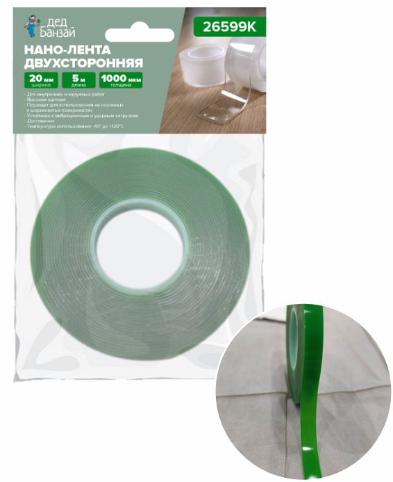 ЛЕНТА ДВУХСТОРОННЯЯ НА ОСНОВЕ ВСПЕНЕННОГО АКРИЛА, сферы применения: для внутренних и наружных работ, высокая адгезия, стойкость к воздействию окружающей среды, подходит для использования на не ровных и шероховатых поверхностях, устойчива к вибрационным и ударным нагрузкам, долговечна,температура использования -40... +120°С. Защитный слой: полиэтилен зеленого цвета. Клеевой слой: прозрачный вспененный акрил. Плотность: 1000 мкм
