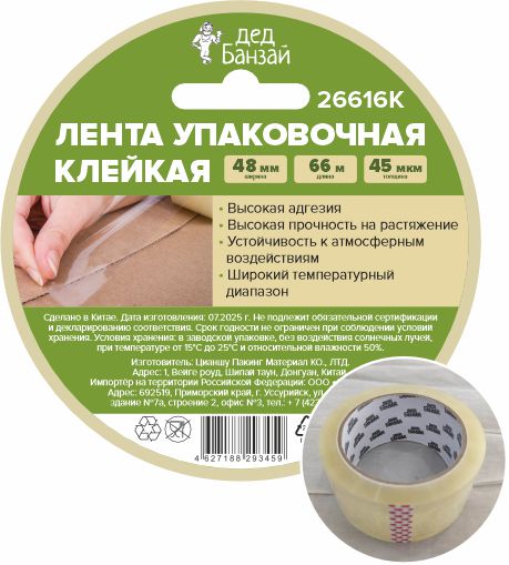 ЛЕНТА КЛЕЙКАЯ УПАКОВОЧНАЯ высокая адгезия, высокая прочность на растяжение, устойчивость к атмосферным воздействиям, широкий температурный диапазон. Основа: двуосноориентированный полипропилен. Клеевой слой: акриловая эмульсия на водной основе. Цвет: прозрачный. Плотность: 45 мкм.