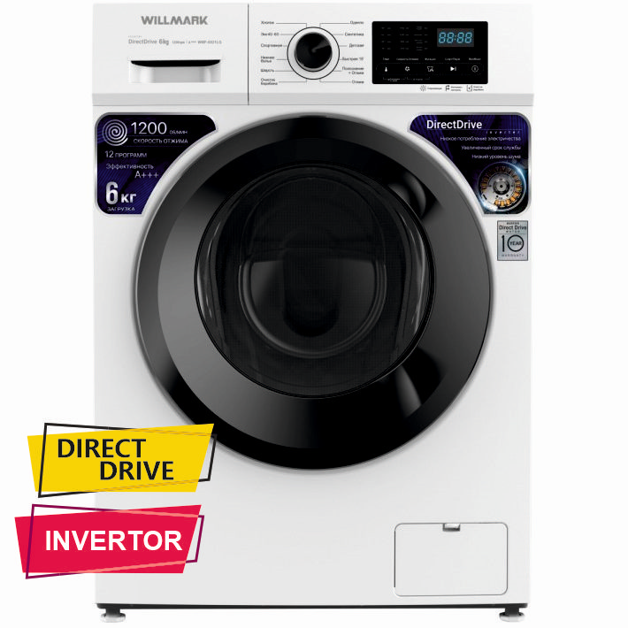 Автомат. Загрузка белья 6,0 кг. Инверторный двигатель. Прямой привод. 12 программ. Отжим 1200 оборотов в минуту. Дисплей. Блокировка панели. Очистка барабана. Отложенный старт. Потребляемая мощность 1650 Вт. Степень защиты оболочки IPX4. Класс энергопотребления А++. Размер изделия 595*480*850 мм.